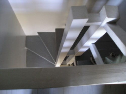Sturdy wooden stairs linking units via doors in the kitchen. These seem to have weathered the abandonment better than any other part of the building.