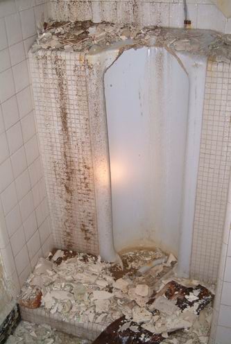 Ah, old-school urinals! Those were cool. It's hard to see in the photo, but this one is filled with water from the leaking pipes and flaking paint.