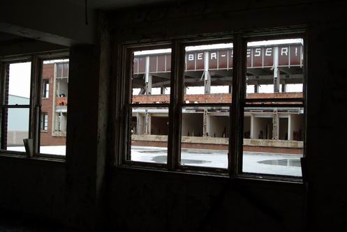 Another wing seen from the middle one. Also pictured is the icy roof of a small building in the courtyard.