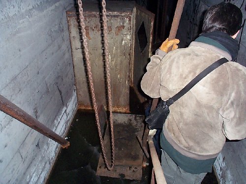 Before heading up to the top of this one, we explored the basement, which was flooded to variable depths. Note here the table and chair to Mokonax's left, frozen neatly in place.