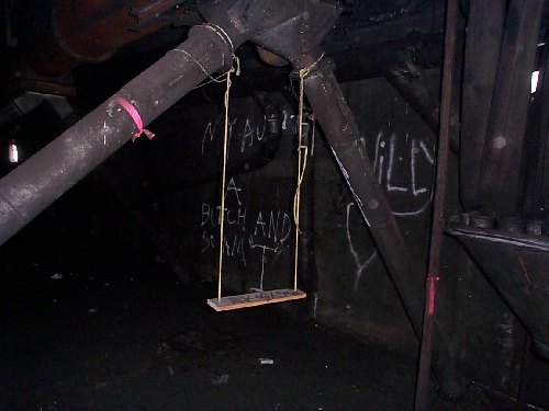 At the top of the second structure we found an array of decorations ranging from this swing, some fake flowers, to the graffiti on the wall.