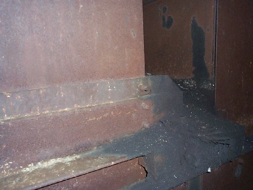 | Here, if you look closely, you can see the remains of a birds wing. This was probably a pigeon. This is our second encouter with oddly-placed birds that don't seem to have been able to get where they are and then died and then stayed there. The bird is buried in a dark-gray dust that infested the entire place. |