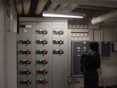 Wotan in front of a bank of air-conditioning-related switches and lights.